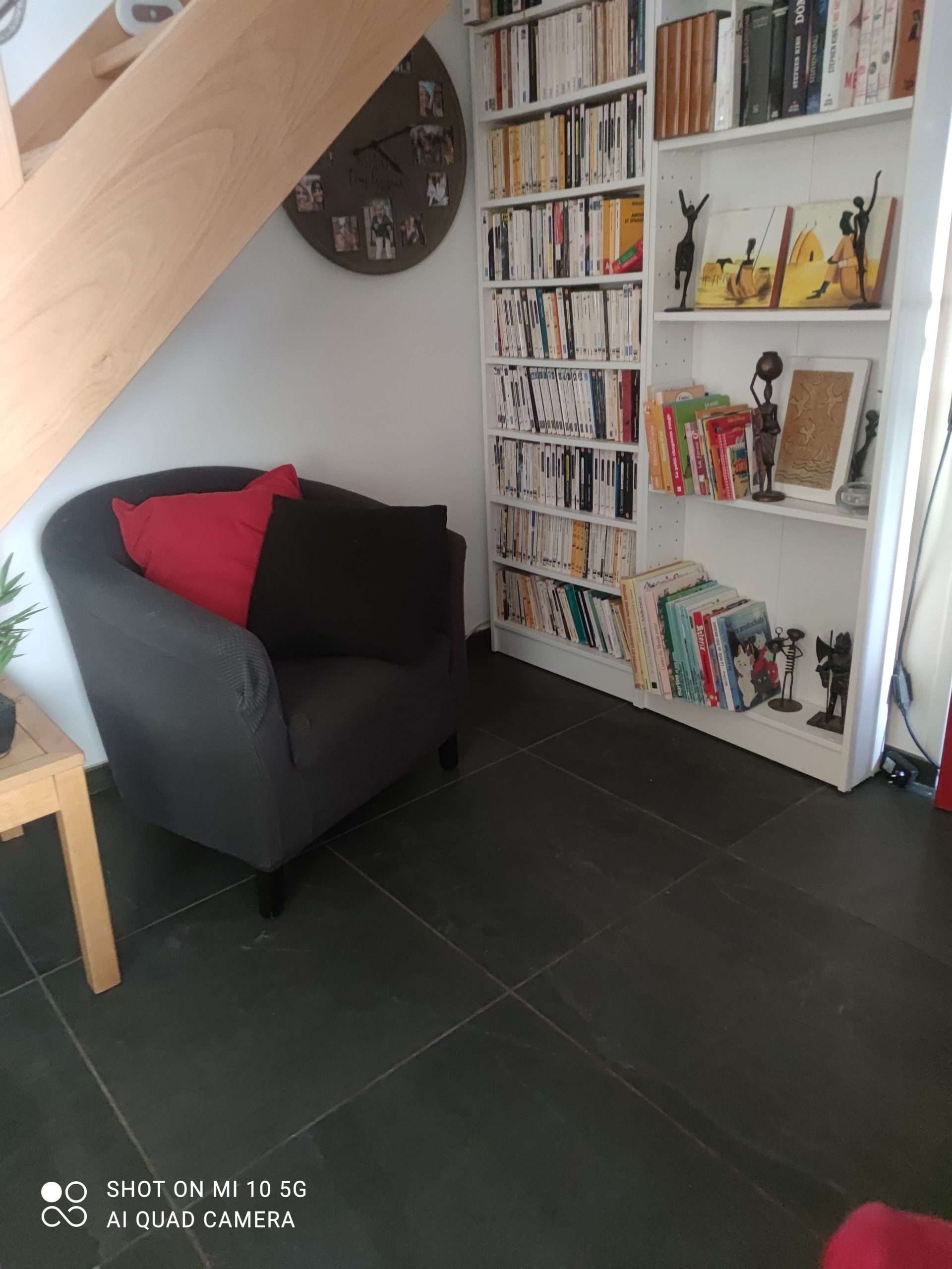 Une entrée-bibliothèque avec un large choix de livres et jeux de société disponibles gratuitement pour petits et grands.